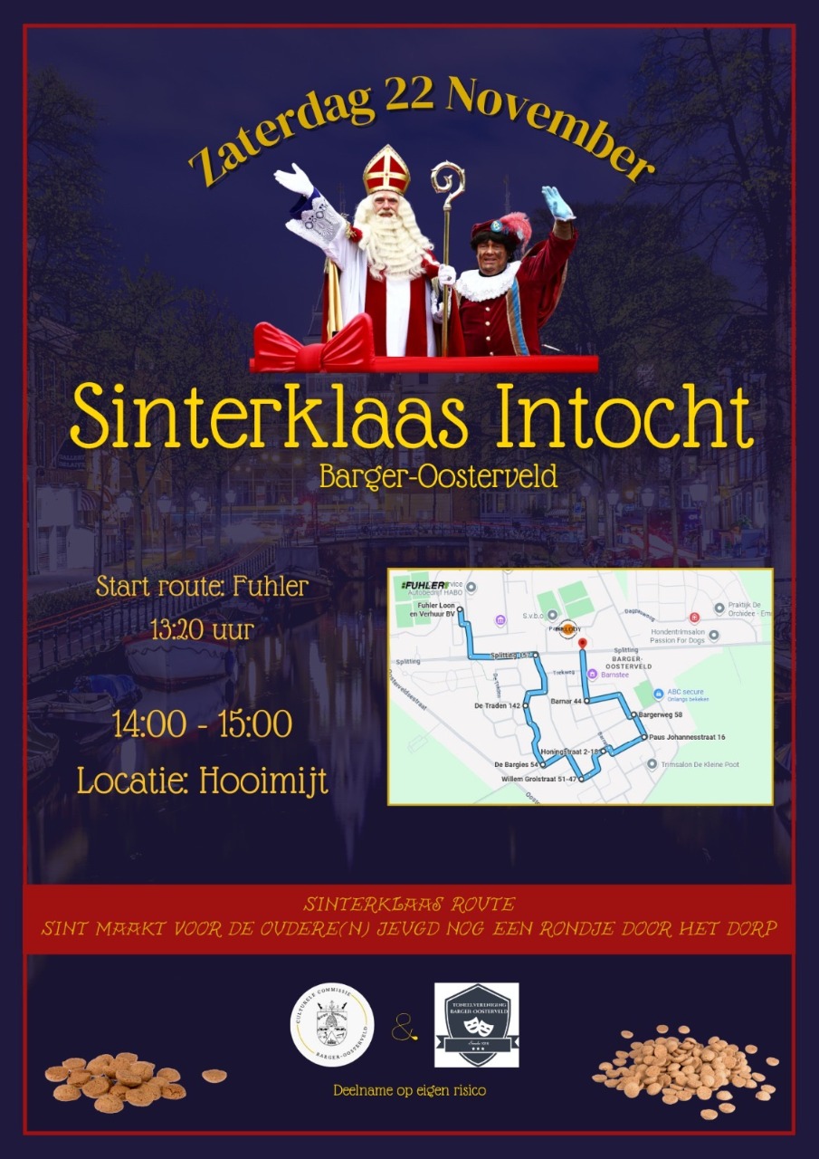De Sinterklaasintocht start om 13.20 uur bij Fuhler, voor aan de Handelsweg. De route van de rondrit door het dorp, staat hierboven op de poster.
